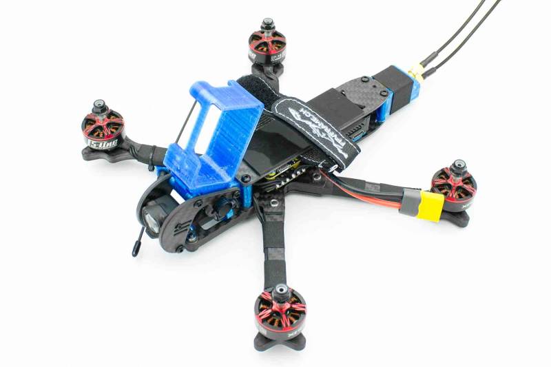 Slide down the TPU front pod mount onto the front two standoffs. Make sure to route the camera cable between the standoffs and look out that you don't damage any motor cable or the antenna cable while pusing down.